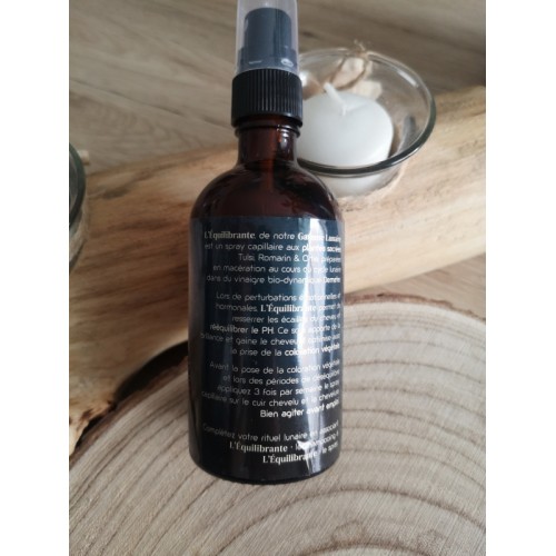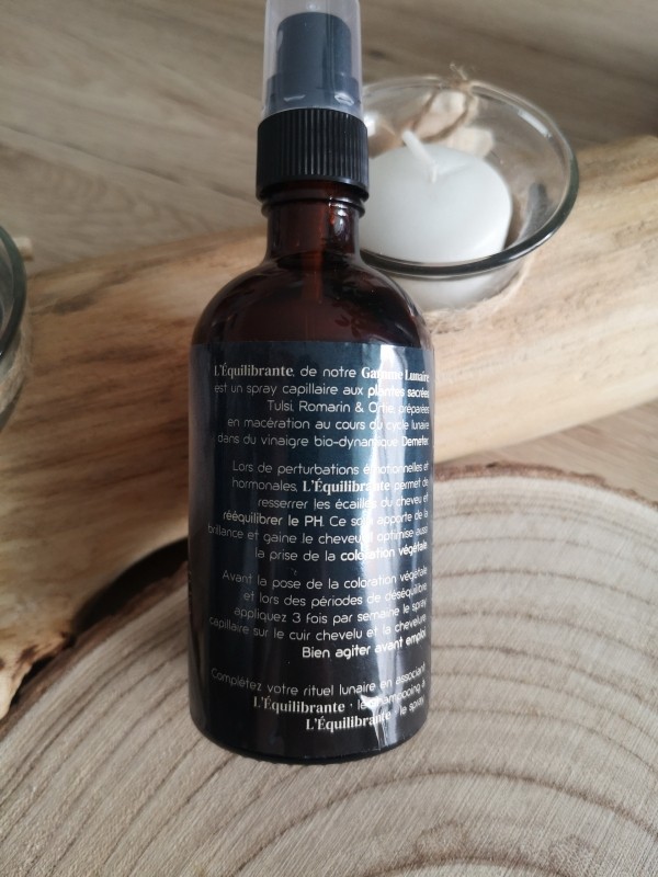 L’Équilibrante, de notre Gamme Lunaire, est un spray capillaire aux plantes sacrées, Tulsi, Romarin & Ortie, préparées en macération au cours du cycle lunaire dans du vinaigre bio-dynamique Demeter.